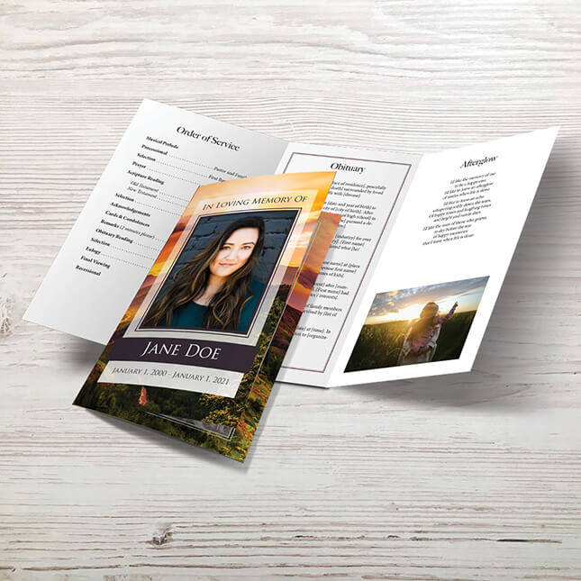 The Hillside Sunset Memorial Package is a vibrant and heartfelt tribute, inspired by the beauty of nature’s peaceful goodbyes. Featuring a radiant sunset over rolling hills, this coordinated collection includes a personalized program, prayer cards, a poster, and other matching keepsakes. Each piece can be customized with beloved photos, names, and messages to honor the life and memory of someone truly special.