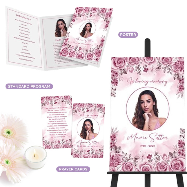This coordinated memorial package includes matching programs, prayer cards, bookmarks, and a memorial poster, ideal for funeral services, celebration of life events, or as obituary keepsakes. Each item is fully customizable with personal photos, names, and messages, allowing you to create a meaningful and lasting tribute that reflects the life of your loved one.